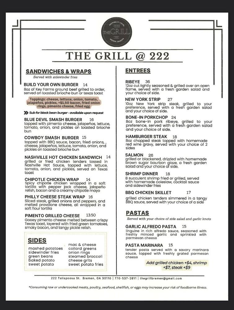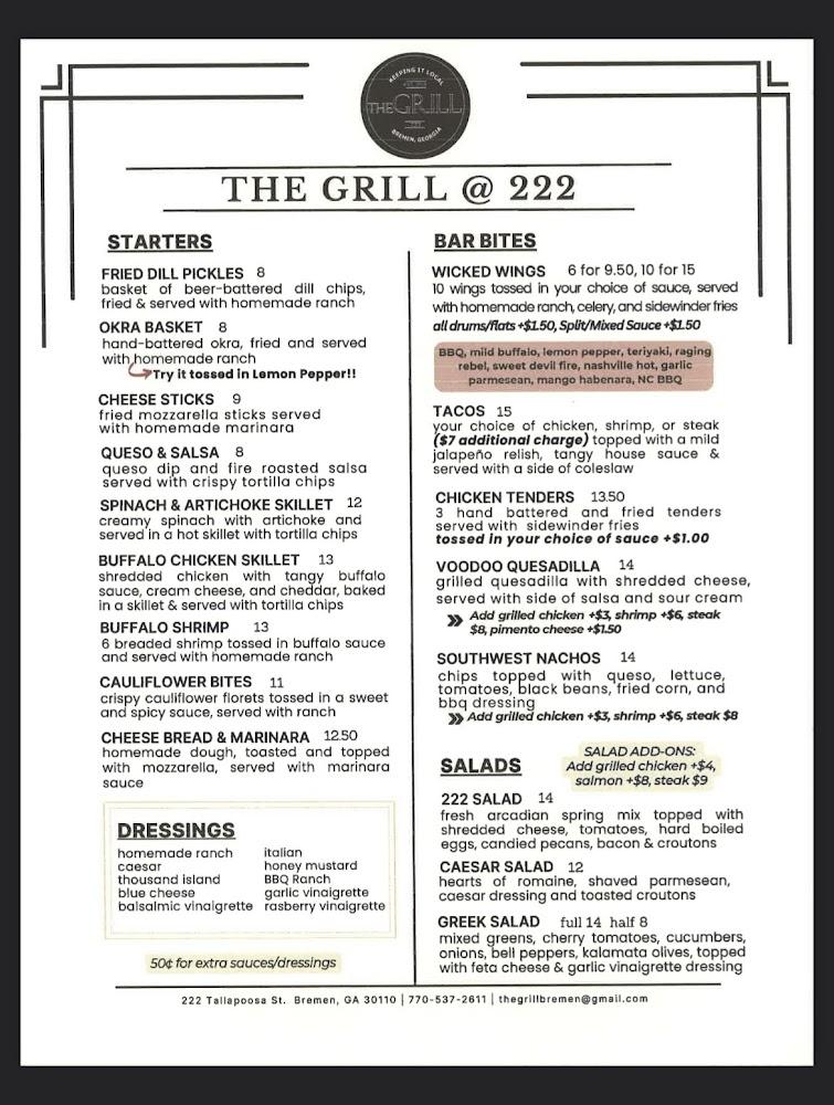 Discover The Grill @ 222, where a vibrant urban atmosphere meets warm, hometown hospitality in Bremen, GA. Our menu features a delightful array of chef-prepared dishes that cater to every palate, from mouthwatering pizzas to savory grill specialties. Whether you're dining in or grabbing takeout, enjoy our excellent cocktails and desserts alongside an impressive selection of beers. Perfect for solo dinners or family outings, our accessible venue ensures everyone can join the fun. With fast service and a welcoming vibe, The Grill @ 222 is the ultimate spot for lunch, dinner, or a special event. Visit us today!